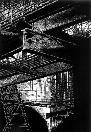 Materiales entrecruzados, osamentas de edificios, escenas donde gigantescas estructuras metálicas aparecen en un estado quieto, inacabado.
