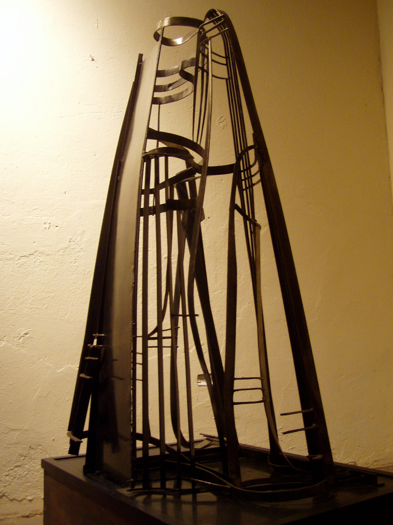 Sculpted metal, attached, building itself dancing endlessly, modeling a fabric.